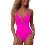 The deep V-neck with ruched cutout detailing and crisscross adjustable back straps adds a flirty, modern touch, while the high-waisted, high-cut leg design elongates your silhouette for a flattering, confident look.
