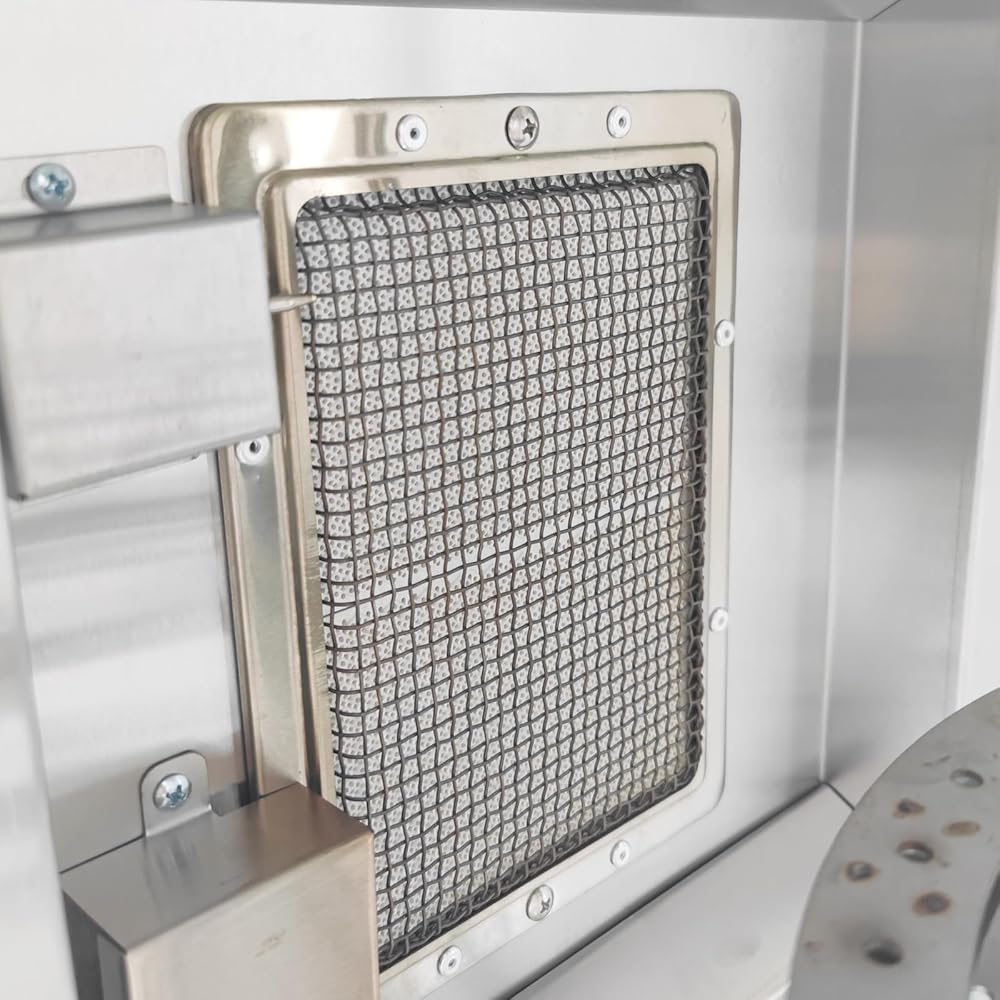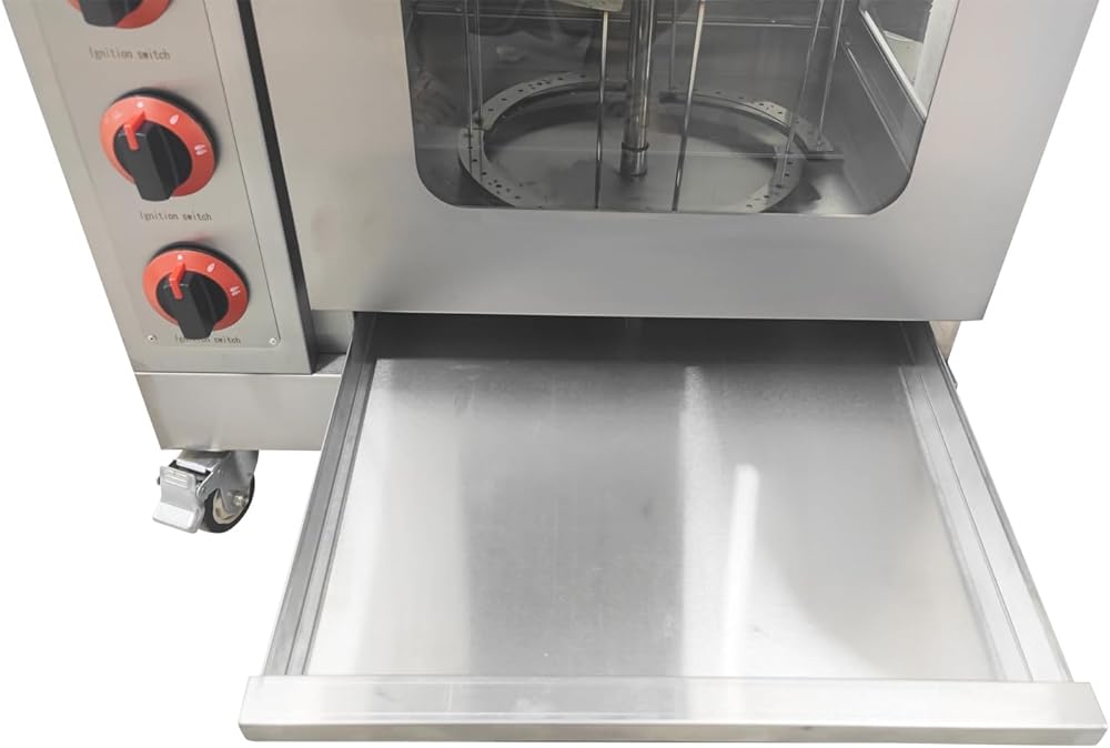 [Removable Oil Collection Tray] The removable grease tray included with the vertical commercial rotisserie oven collects dripping fats and food particles during cooking, keeping the oven clean by reducing grease buildup inside. Its detachable design simplifies cleaning, lowers routine maintenance time, and extends the equipment's service life