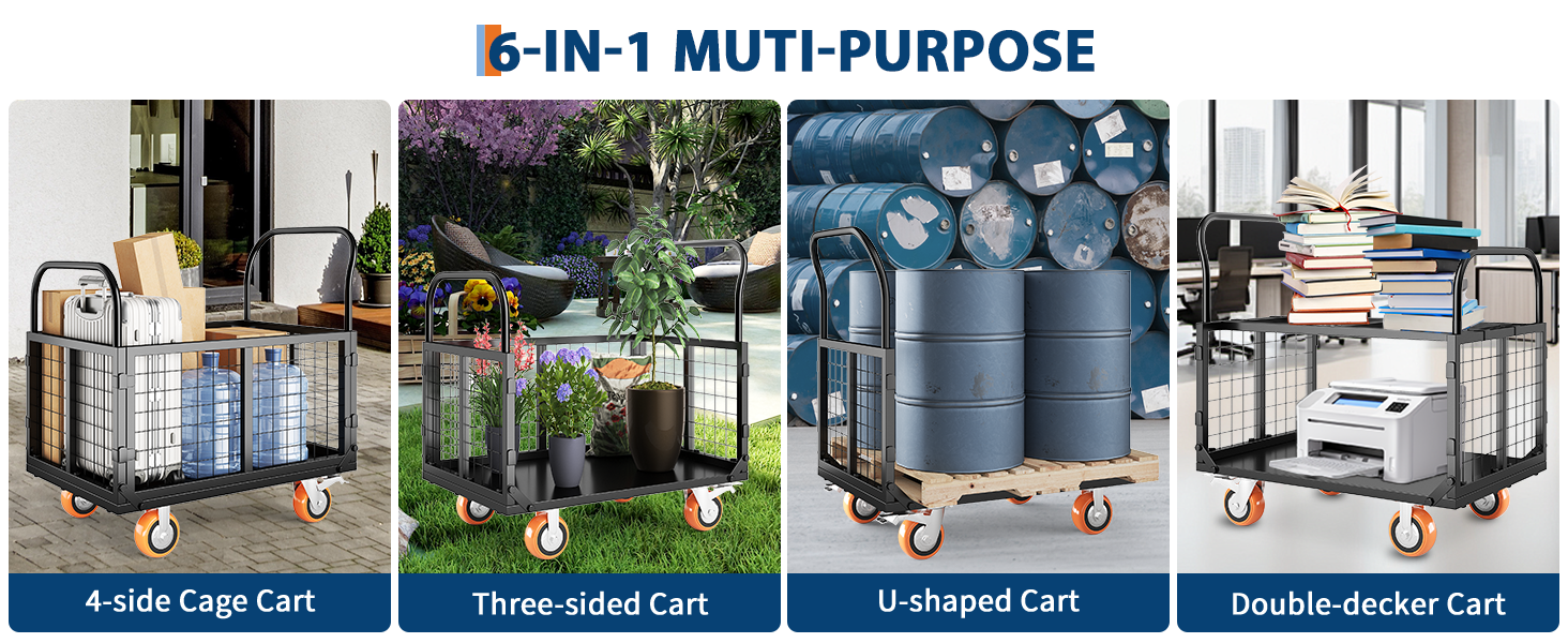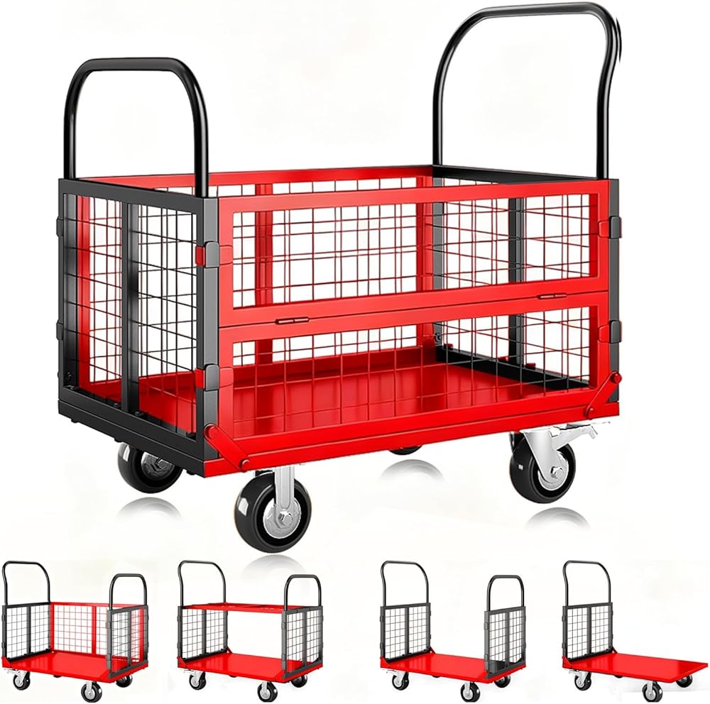 【4-in-1 Muti-purpose Design 】This platform truck cart easily transforms into a hand truck, heavy-duty dolly, flat cart and market stall cart, making it perfect for various tasks. Whether you're moving boxes, furniture, or heavy equipment, this cage cart adapts to your needs, offering unmatched versatility.