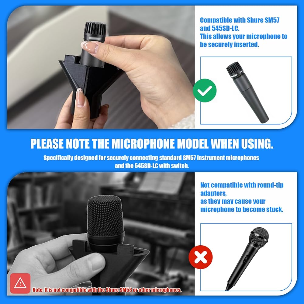Manufactured from a tough, lightweight 3D-printed polymer, this holder won't weigh down your boom arm. The genius slide-on design requires zero tools—just push it onto the microphone and you are ready to play. The secure four-prong grip holds your standard 10-hole diatonic harp firmly in place without scratching the cover plates, while still allowing you to pull it out and swap keys in seconds. Compatibility Specifications: Microphones: Exclusively compatible with Shure SM57 and Shure 545SD-LC dynamic microphones. (Note: It will NOT work with a Shure SM58, or any other microphone.)