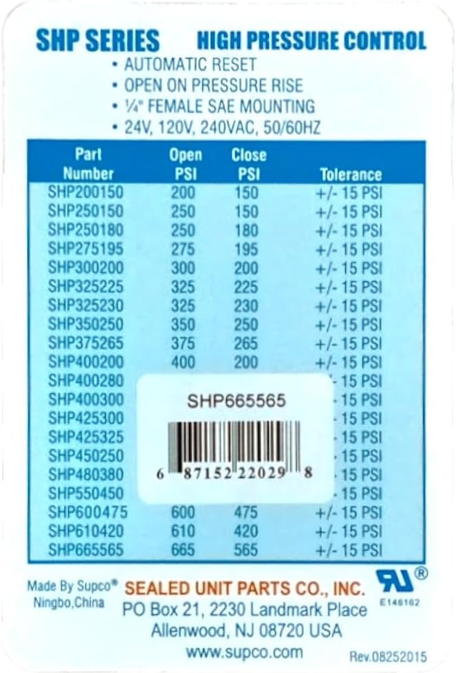 Supco Part number SHP665565 Open: 665 PSI Close: 565 PSIHigh pressure switch opens on pressure rise High precision controls at economical prices. Encapsulated, non-adjustable, single pole - single throw, direct mount switches for use with HFC, HCFC, and CFC refrigerants Features: ¼" SAE 45 female flare fitting with valve core depressor High pressure switch opens on pressure rise Life at rated load: 100,000 cycles Automatic Reset Rated Voltage 24/120/240 VAC @ 50/60 Hz Snap acting stainless steel hermetically sealed sensor Wire is 18 AWG, 18" long Small size and light weight for direct mounting Excellent set point repeatability/stability Specifications: -31F to 149F (-35C to 65C) UL Recognized, CE Max Pressure 700PSI