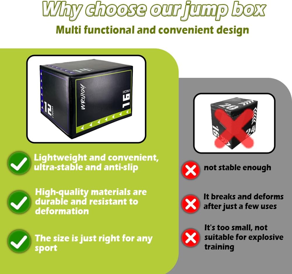 Premium Materials - This plyometric box is built with high-density foam and a tough PVC cover materials, with an upgraded non-slip surface and filled with recycled materials for added weight and stability. Its load-bearing capacity of up to 220 pounds (about 100 kg) ensures stability during high-intensity training, allowing you to focus on training without worrying about the durability and safety of the equipment.