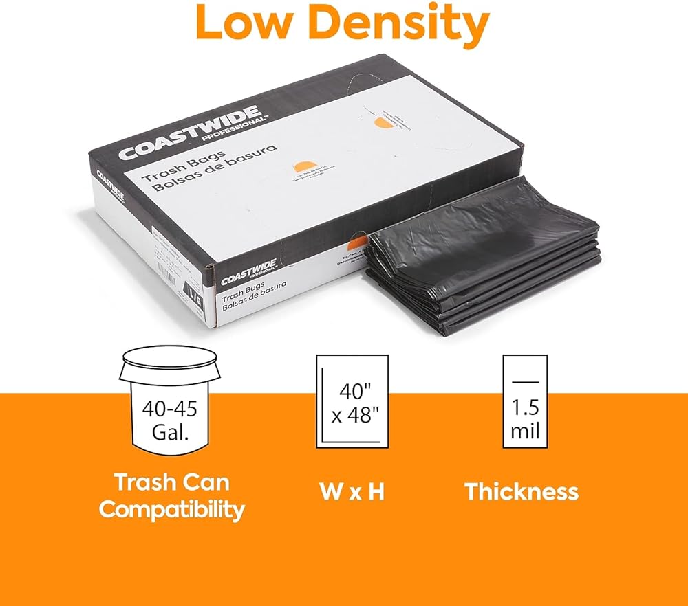 Coastwide Professional 40-45 Gallon Trash Bag, 40" x 48", Low Density, 1.5 mil, Black, 50 Bags/Box