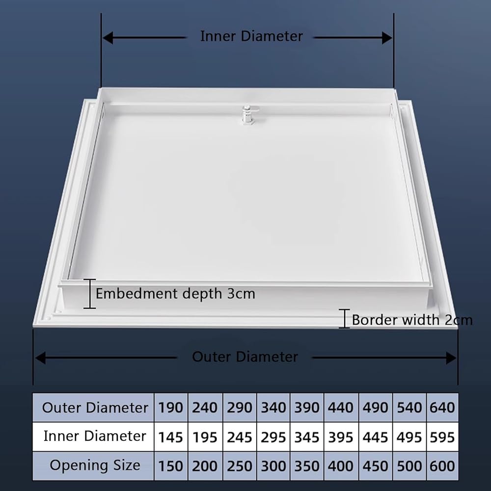 Introducing our versatile Pipe Access Door, the ideal solution for renovation and maintenance tasks. This essential addition to your toolkit facilitates quick access to pipes and wiring, making it suitable for both residential and commercial environments. Our access doors are designed with a secure locking mechanism and flat head screws, allowing for easy opening and closing with a screwdriver—no key necessary. This thoughtful design protects your valuable equipment and reduces the risk of items falling through, ensuring a safe and organized workspace. Available in classic colors like white and gray, our access doors seamlessly blend with various interior styles, from contemporary homes to professional offices and busy shopping centers. The minimalist design not only enhances your space but is also easily repaintable to match your décor preferences. **Specifications:** - Material: Aluminum alloy frame with a galvanized panel - Color Options: White, Gray - Sizes Available: 300×300mm, 350×350mm, 400×400mm, 450×450mm, 500×500mm, 600×600mm - Suitable for: Ceiling and wall installations **Packing List:** - 1× Access Panel (screws not included) **Important Note:** Please measure your opening dimensions before selecting a size. Due to manual measurement, a slight variance of 0-1 cm (0-3/8") may occur. Enhance your renovation projects with our reliable and stylish Pipe Access Door, providing convenient and safe access to essential systems while maintaining the aesthetic of your space.