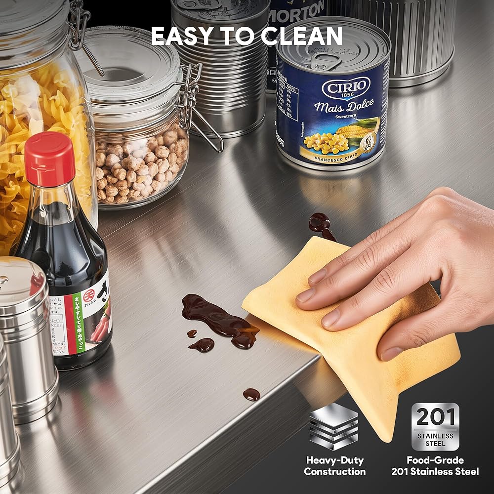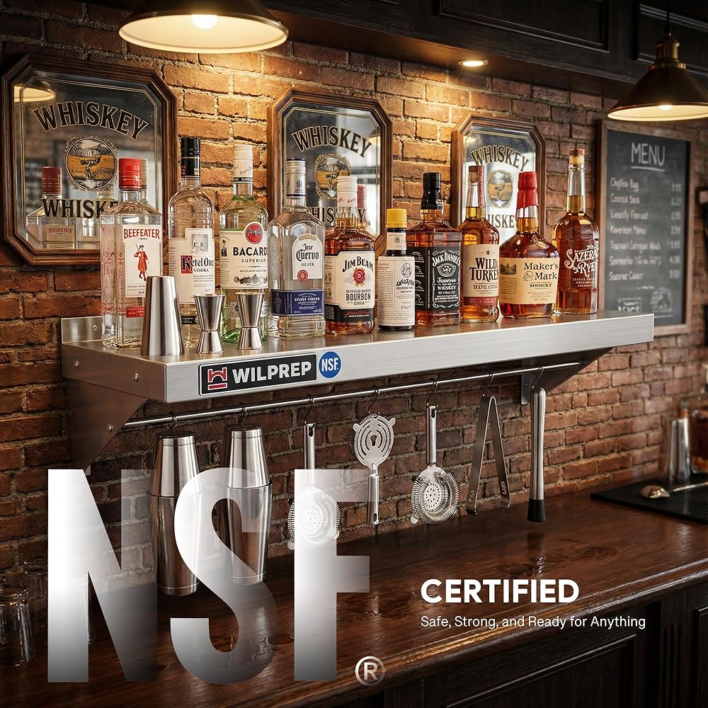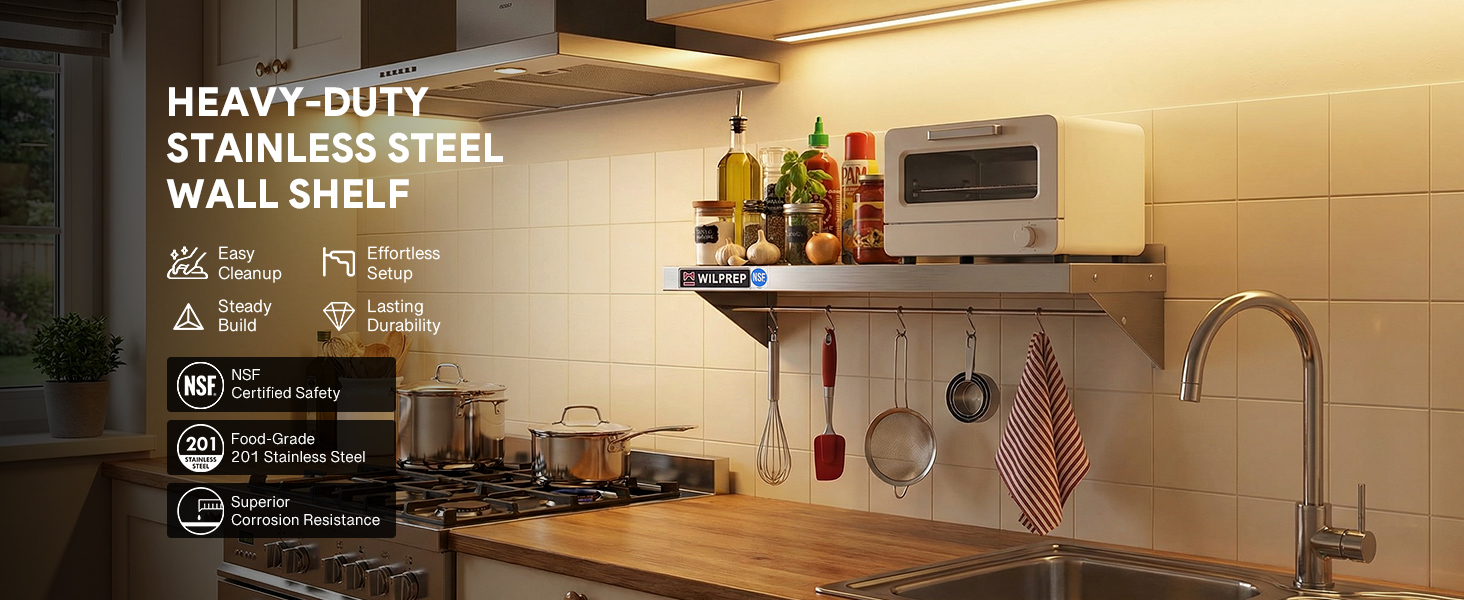 NSF-Certified Safety: Made from NSF-approved food-grade stainless steel, this commercial shelf stays corrosion-resistant and safe for daily use. Wiping it clean is quick and easy, keeping your counters and walls looking fresh and polished every day