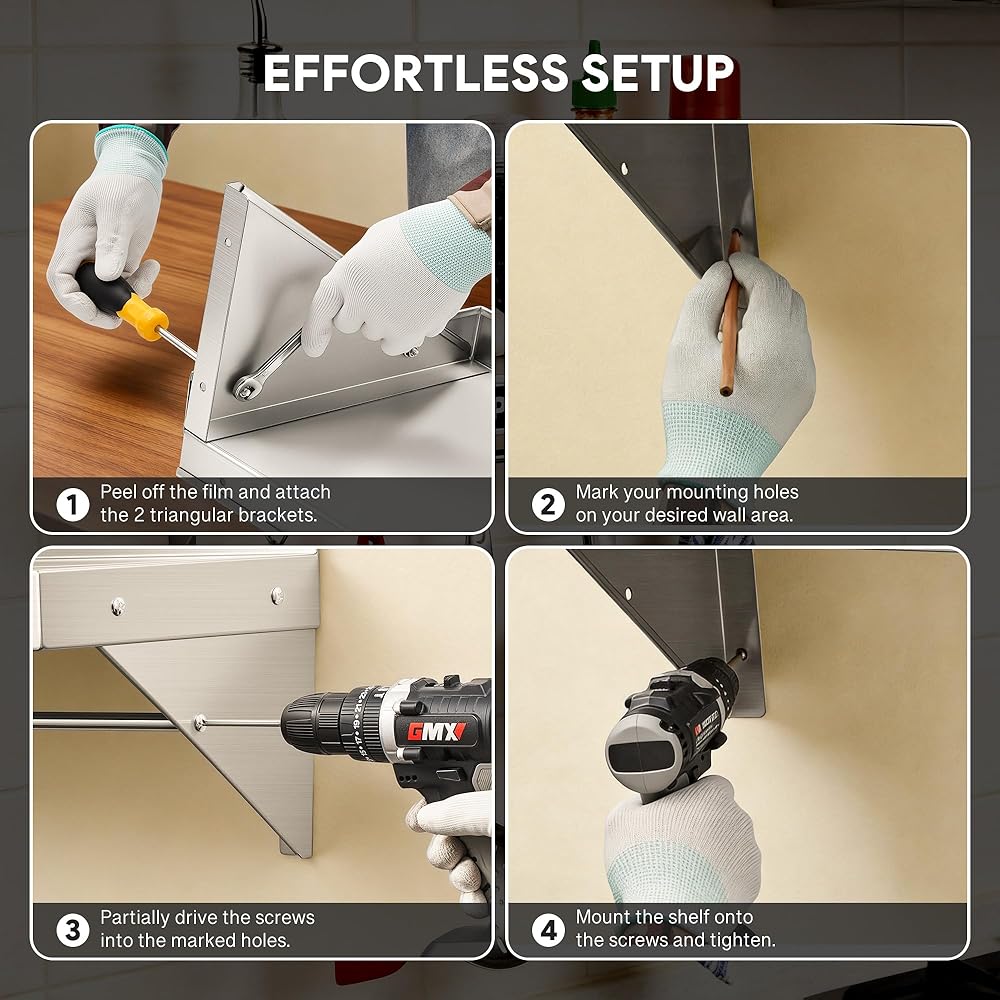 Rock-Solid Strength: Built with 0.05 in. thick stainless steel and triangular support brackets, our kitchen shelf holds up to 220 lb. without wobbling. From pots and pans to appliances, it keeps everything secure while looking professional