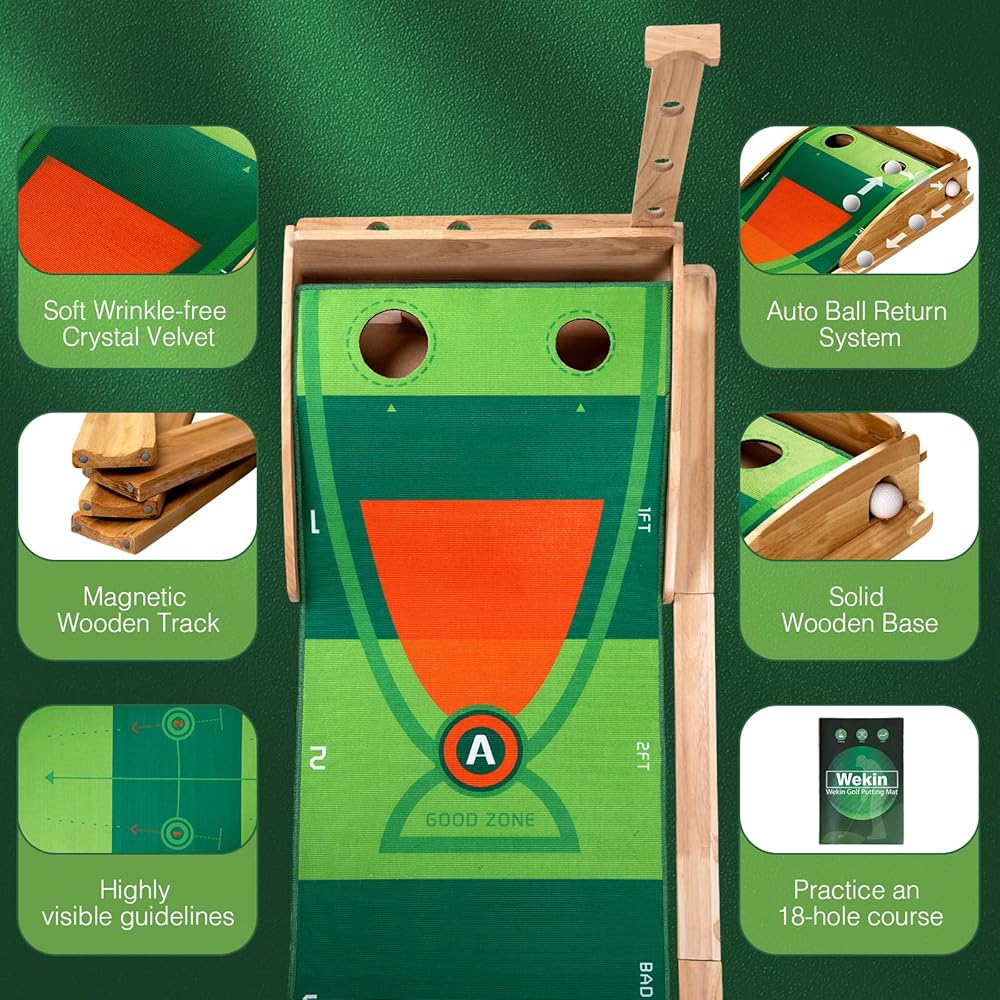 Wekin Golf Putting Mat that lets you practice from different angles and distances in your living room, office, or any indoor space and outdoors.