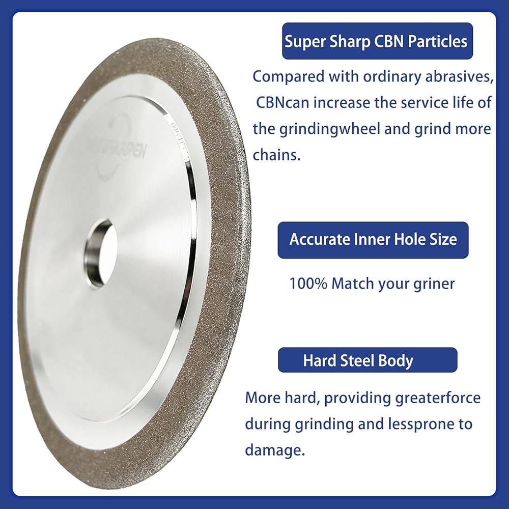 【High Quality and Professional】: This CBN chainsaw sharpening wheel is specially designed for grinding chainsaws. The CBN particles are electroplated for a longer service life and sharper