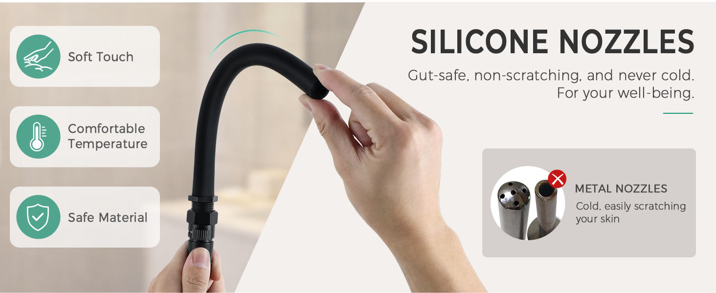 SOFT YET FIRM, ACHIEVING DEEP CLEANSING: Unlike metal enema nozzles, silicone nozzle is firm yet flexible, providing optimal support for deep and comfortable insertion. It maintains a natural, skin-like temperature and is designed to reach further into the intestines for a complete, thorough cleanse. Suitable for colon issues, postoperative recovery and intimate hygiene care
