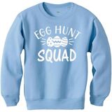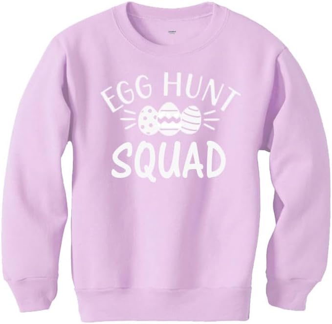 DESIGN: Adorable Easter-themed sweatshirt featuring 'Egg Hunt Squad' text with decorative egg graphics in white print on a light purple background