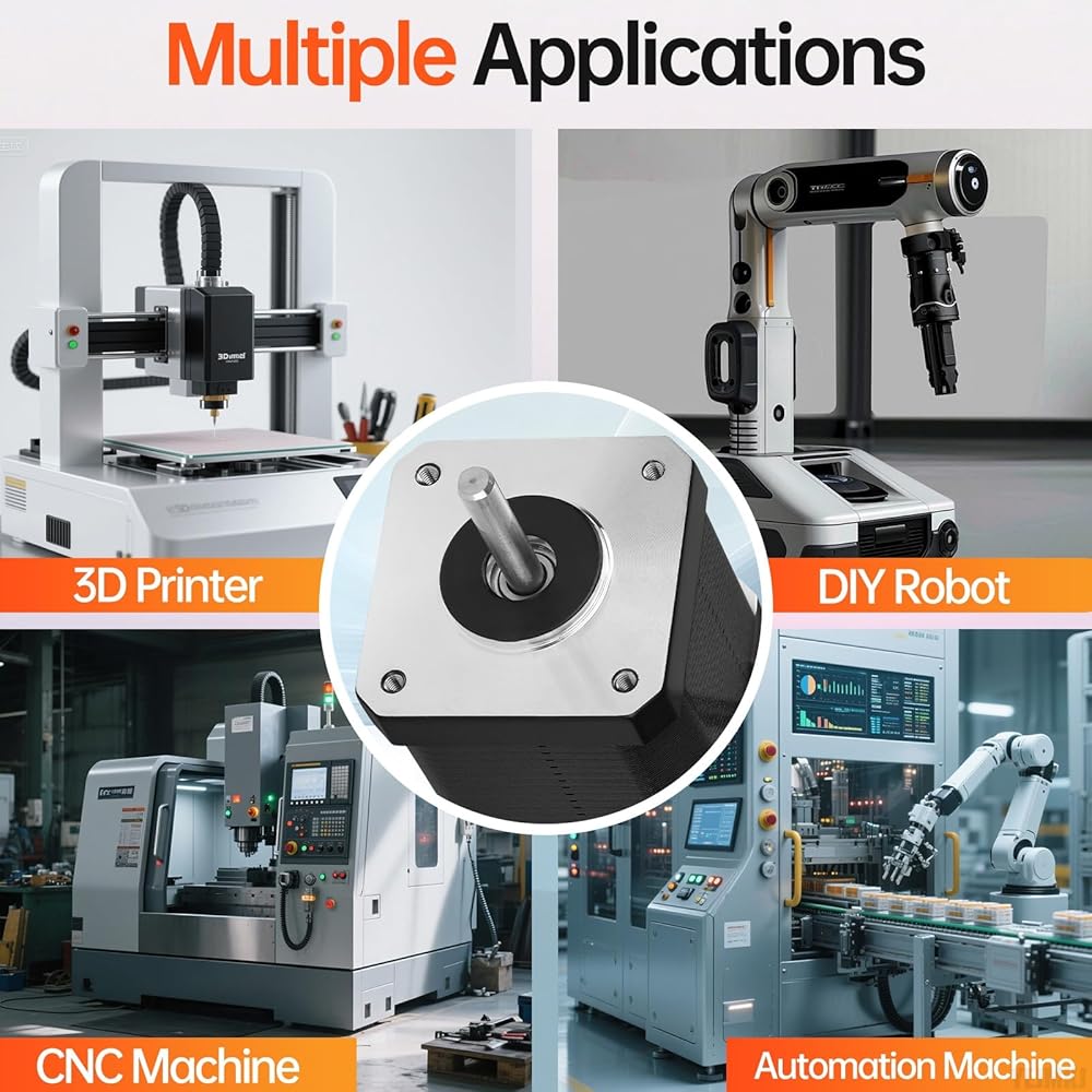 Things to Note: Increasing speed lowers torque, with the recommended range of 0–600 RPM. Lower current results in lower torque and temperature rise, while reduced voltage decreases torque (range: 12–24V DC). In 3D printers, DIY robots, and CNC machines, the 42mm Stepper Motor's compact size and high torque are perfect for a variety of demanding applications.