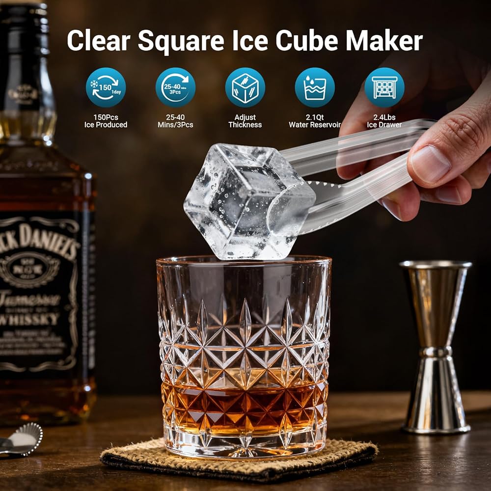 Large Capacity - More Convenient: Features a 2.1 Qt water tank, can produce 150 ice cubes daily. The removable ice basket holds 8-10 cubes, making it the perfect companion for whiskey and other drinks