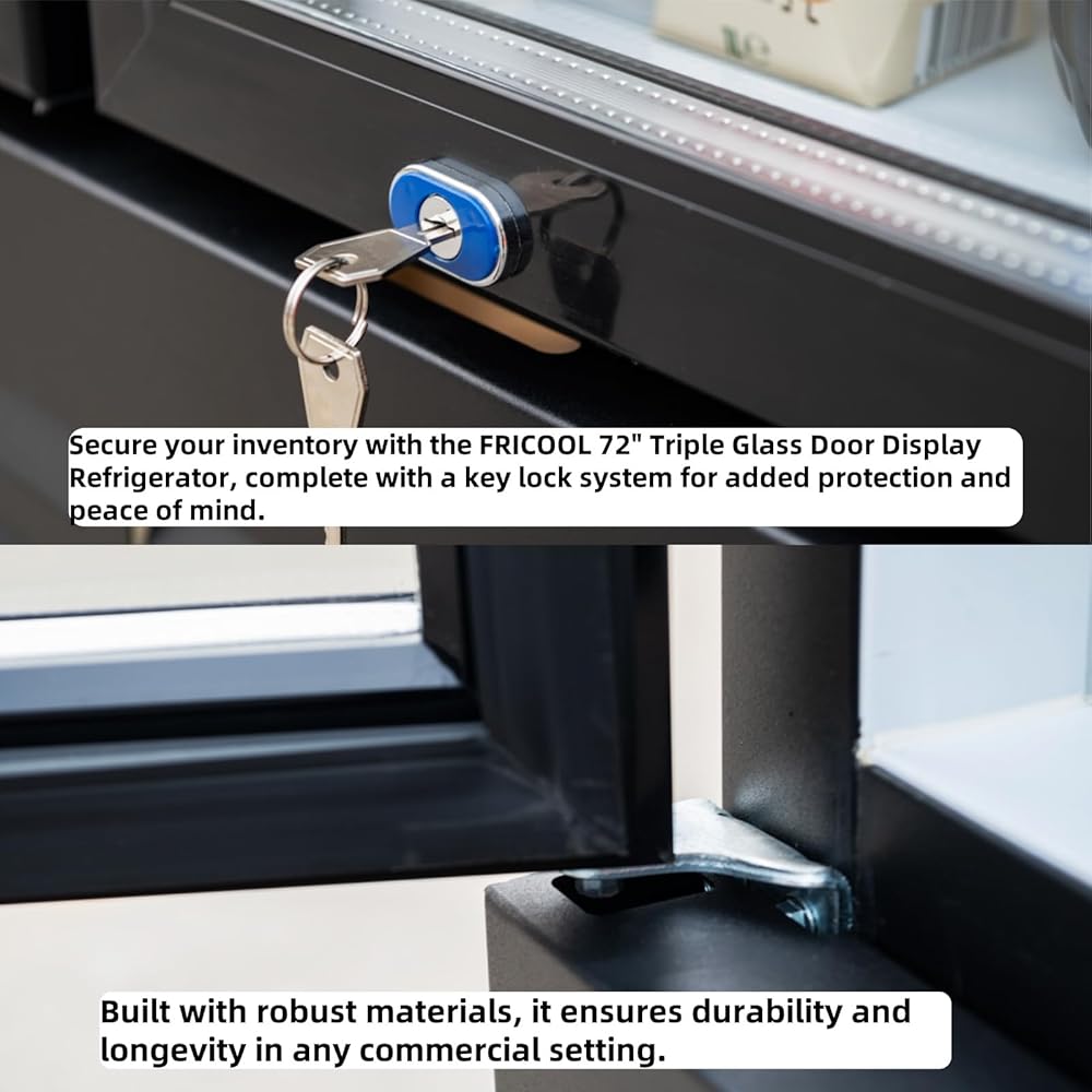Energy-saving and safe: LED lighting, Lock mounted glass doors to keep food safety, standard door locks can provide more security for merchants, swing door self-closing, independent light switch, energy-saving.