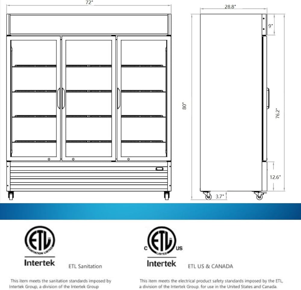 Merchandiser Refrigerator 3 Glass Door, 56 cu ft Beverage Display Cooler, Commercial Upright Fridge with LED Lighting, Adjustable Shelves for Displaying Beverages, Beer, and Drinks, Black