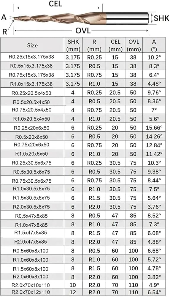 1pcs/5pcs Tapered Ball Nose End Mill 2 Flute Carbide Spiral Milling Cutter 3.175-12mm Shank CNC Router Bit for 2D and 3D Engraving(R0.25x30.5x6x75,1PCS)