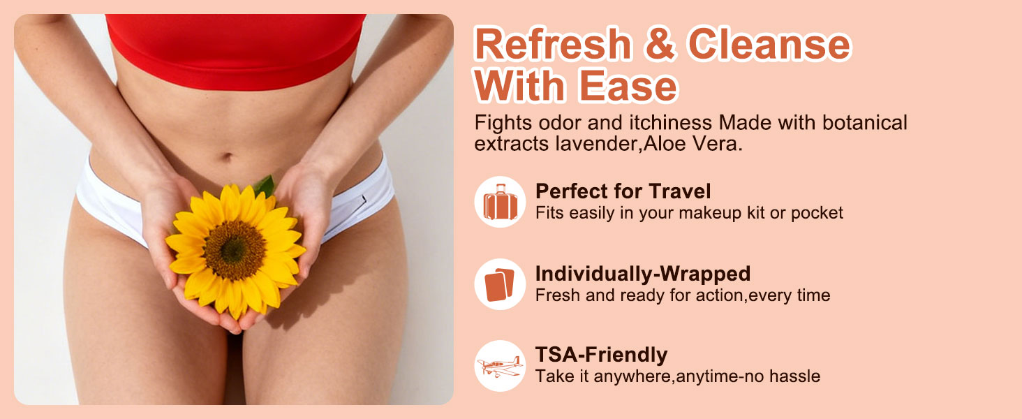 Perfect on-the-go travel wipes:these wet wipes intimate are very convenient to carry,whether for travel,outdoor activities,or daily life,they can be placed in a backpack,pocket,or handbag.Packaging bag size:2.4*3.1inches,Each wipe measures 5.5*6.3 inches.These wipes all offer the ultimate in odor protection and vaginal itch relief.