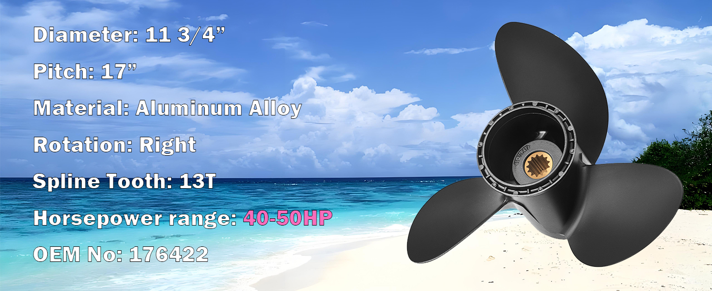 【Important Size Information】: This prop has 13 Spline Tooth; 11 3/4" Diameter x 17" Pitch; Rotation: Right; Blade: 3. Fit Johnson Evinrude Engines 40-50HP, Reference No.176422. Please kindly check it. Make sure it's same with your previous prop.