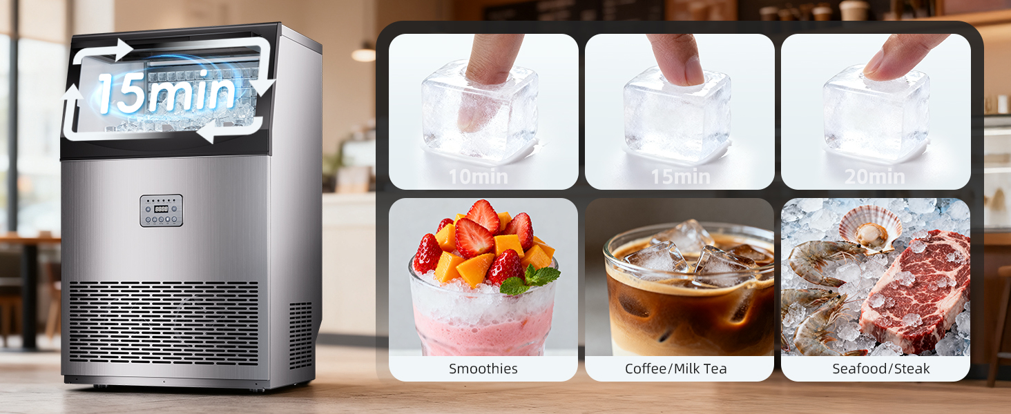 Stay Prepared with 110lbs Daily Ice Output: Never get caught short during busy events or peak service hours. This high-performance ice maker produces a reliable 110lbs of ice every 24 hours, generating 50 clear cubes per cycle to match your highest demand. The generous 33lbs storage bin keeps ice ready whenever you need it—perfect for keeping cocktails chilled, coffee iced, and customers happy without interruption