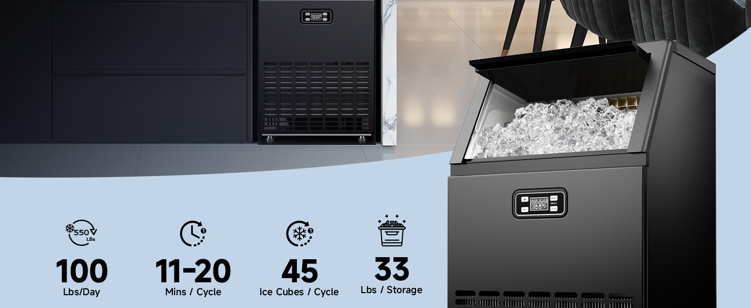 Commercial Ice Maker, Producing 100 Lbs/Day, 45 Cubes in 15 Minutes, Under Counter Ice Maker with 33 Lbs Storage, Self-Cleaning, Timer, Ideal for Home, Bar, or Cafe (Commercial Grade, Black)