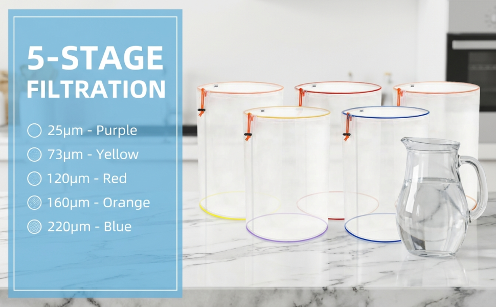 【5 Micron Sizes for Perfect Filtration】Our 17 piece tea filter bags includes 5 reusable nylon mesh filter bags in different micron sizes (25, 73, 120, 160, 220 microns). The 25-micron bag filters fine coffee grounds and tea dust, while the 220-micron bag handles coarse fruit pulp and hydroponic nutrients. Color-coded bottoms make identification effortless.