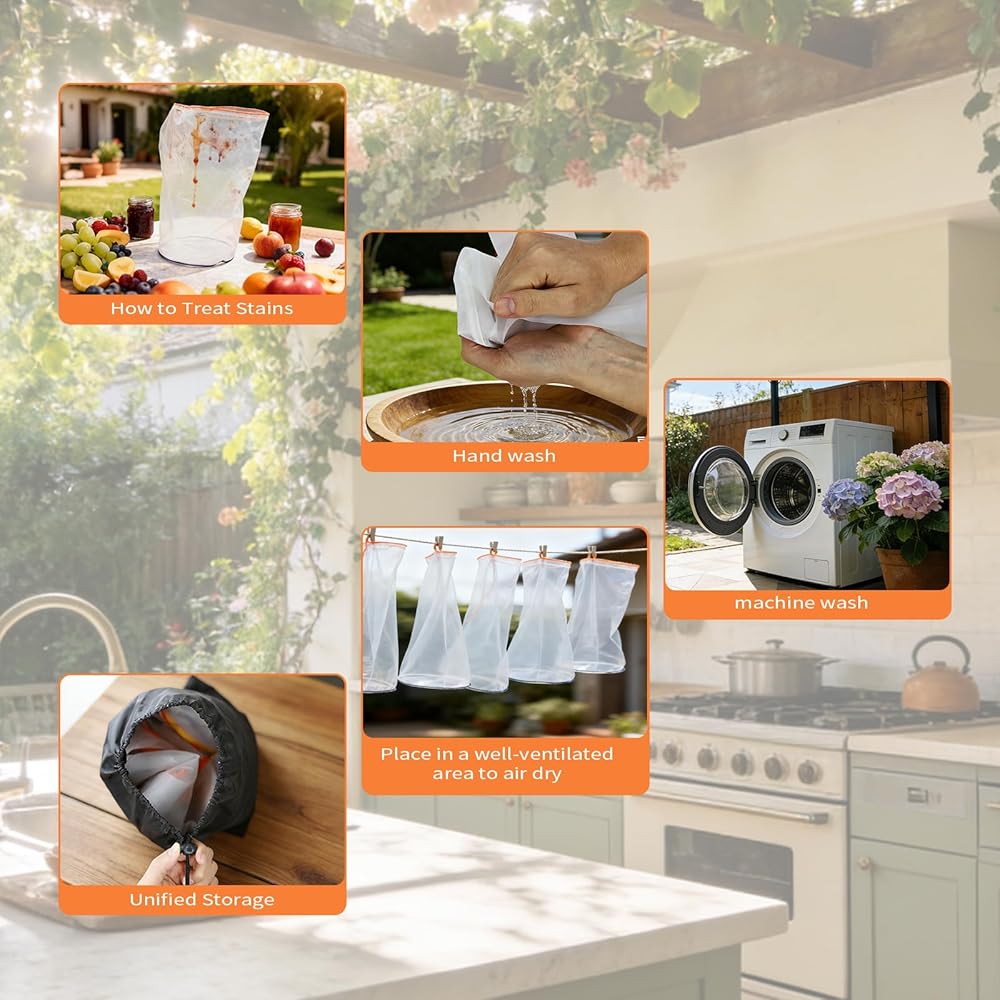 【Food Grade All Mesh Design】-Brew bag made from 100% food-grade nylon mesh that's odorless, residue-free, and BPA-free. Unlike traditional filter bags with plastic bottoms, our all-mesh design allows 360° filtration, preventing liquid pooling and ensuring maximum extraction efficiency. Machine washable and reusable for years.
