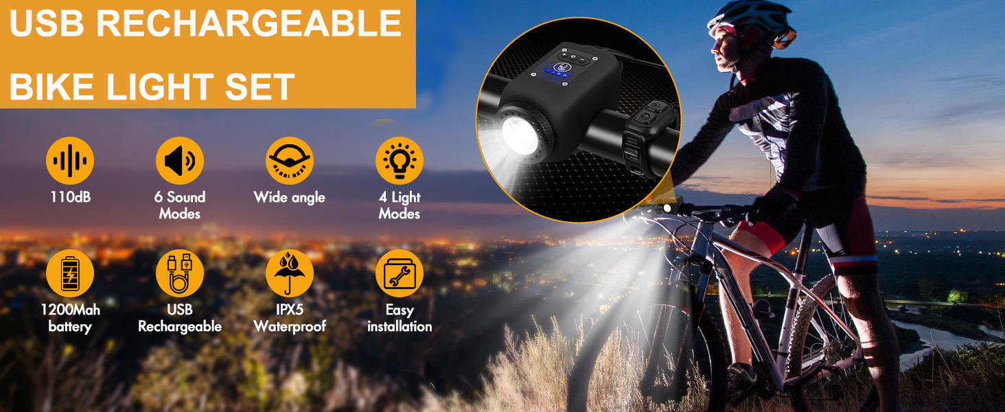 【Quick Installation】This electric bike horn can be easily mounted and secured with the stretchable straps. No tools need. You can install or uninstall it within 20 seconds. Enjoy sports with our bike headlight and tail light set.
