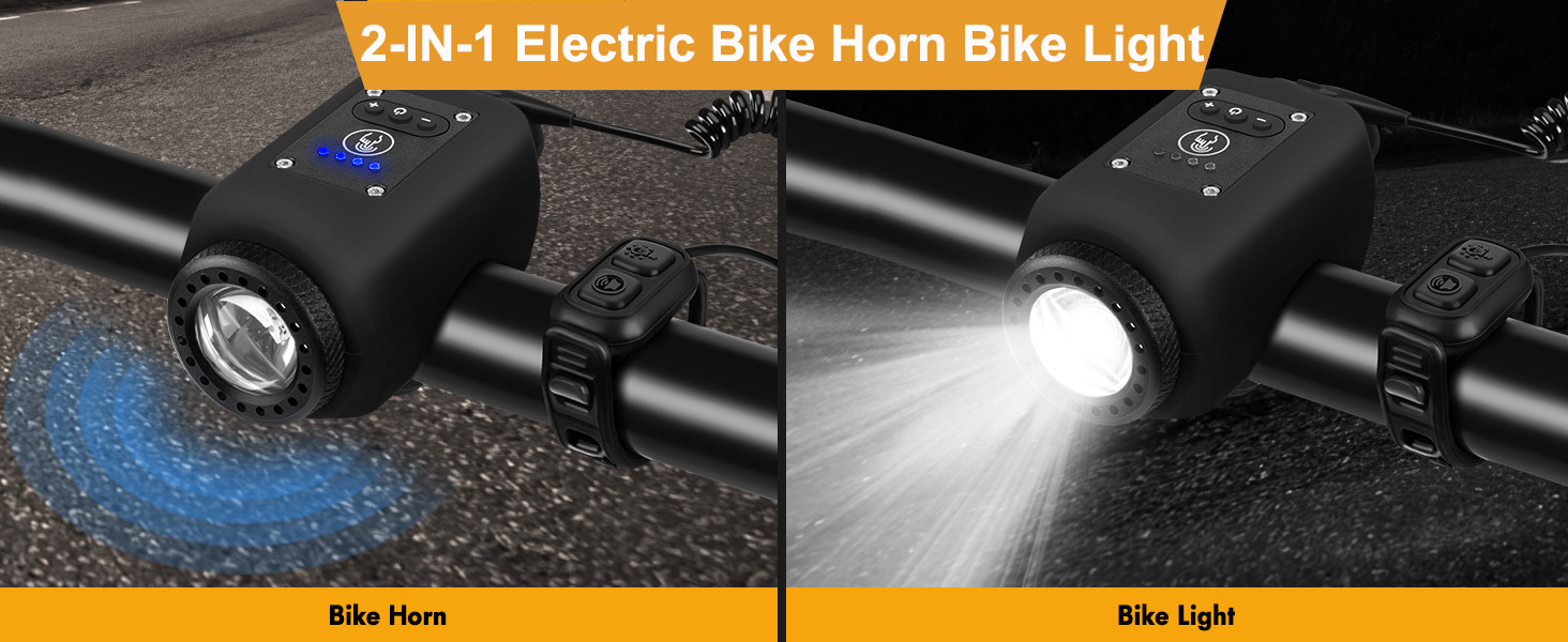 【2026 Electric Bicycle Horn and Light 2 in 1】It comes with a rechargeable bike horn and light to ensure your safety when riding at night. The Ebike horn provides 110db sound to warn your surroundings for added safety.