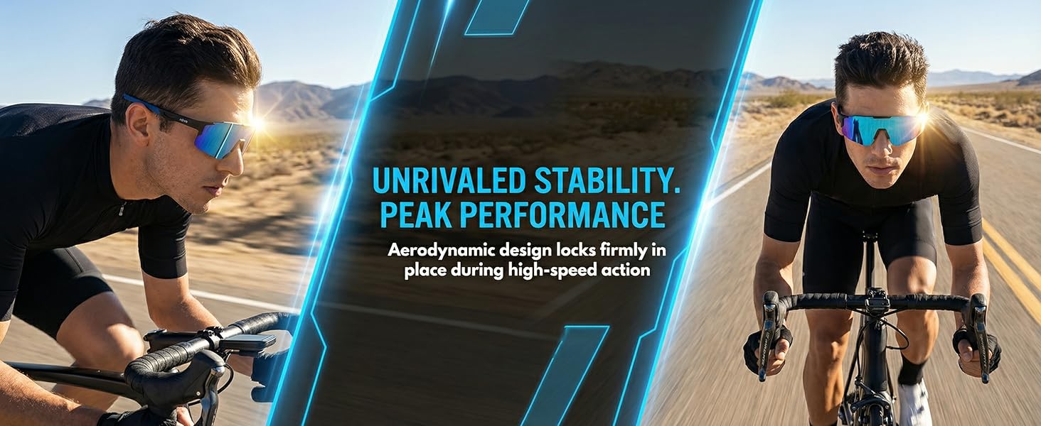 【UV400 Protection】Our cycling goggles provide UV protection against harmful UVA/UVB rays, provide effective protection for your eyes in strong sunlight, ensure clear vision and make seeing in sunlight more comfortable. Special design: The hollow geometric structure at the mirror legs not only reduces weight, but also has the functions of ventilation and rapid heat dissipation, reducing sweat accumulation.