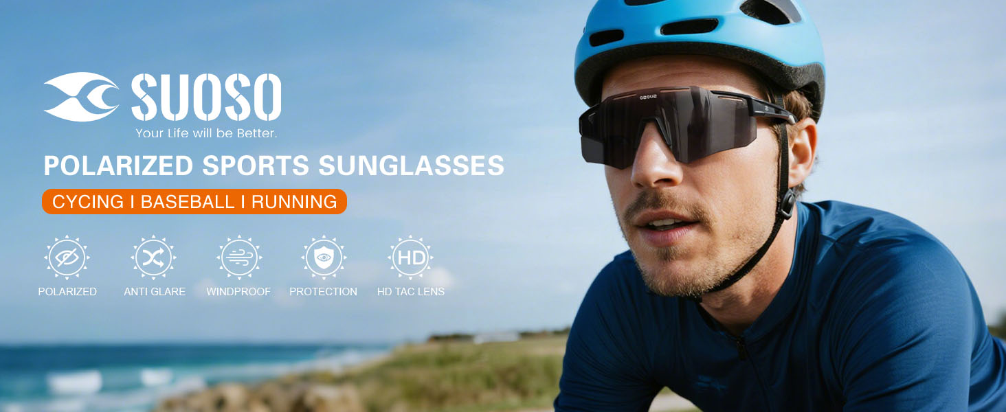 Durable & Impact-Resistant Design:Suoso men's sunglasses are built with TR90 frames, known for their durability and impact resistance, making them tough enough to handle intense activities without breaking. The lenses are made from TAC material, which is scratch-resistant and easy to clean, ensuring long-lasting clarity even during rigorous sports.