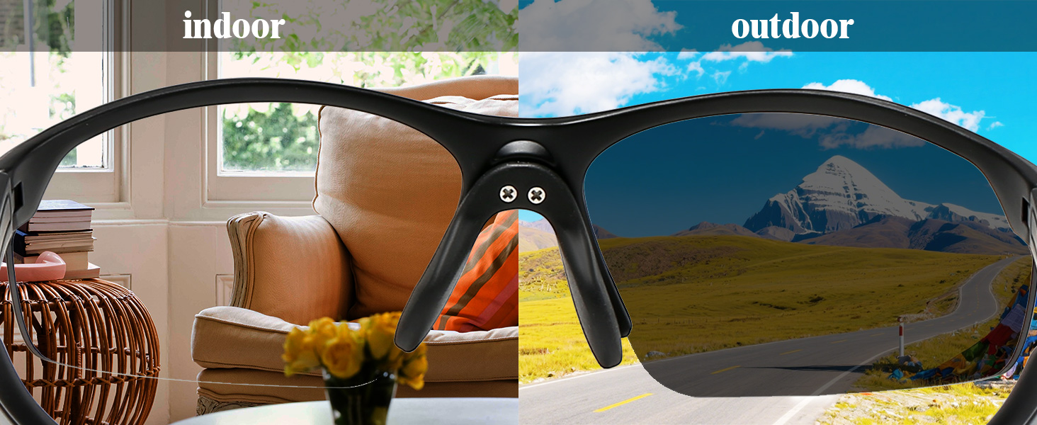 【Photochromic Lenses】Photochromic lenses darken and lighten as the outdoor light changes without needing to switch between glasses, the color of photochromic sunglasses will change from clear to grey in sunny, Effectively protecting your eyes and maintaining a comfortable light.