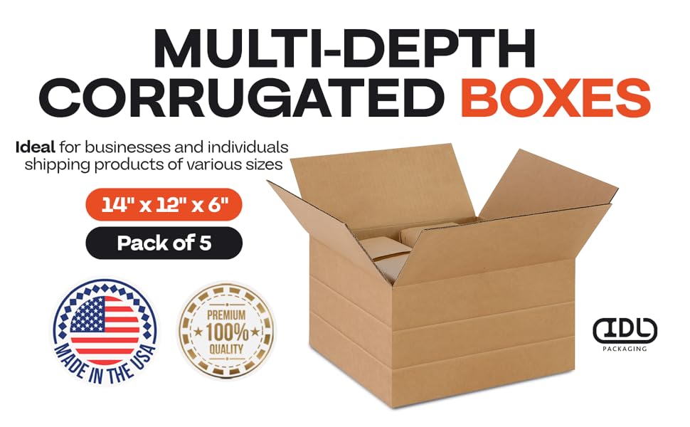 Multi-Depth Corrugated Shipping Boxes, 14"L x 12"W x 6"H, Pack of 5 - USA-Made Boxes for Moving, Storage & Small Business Packaging - Heavy-Duty Cardboard Bines for Household & Office by IDL Packaging in Kuwait