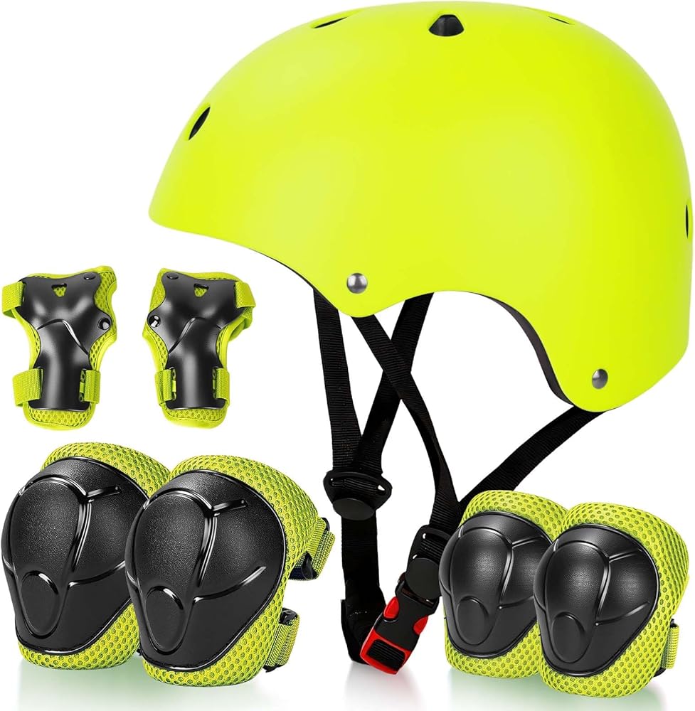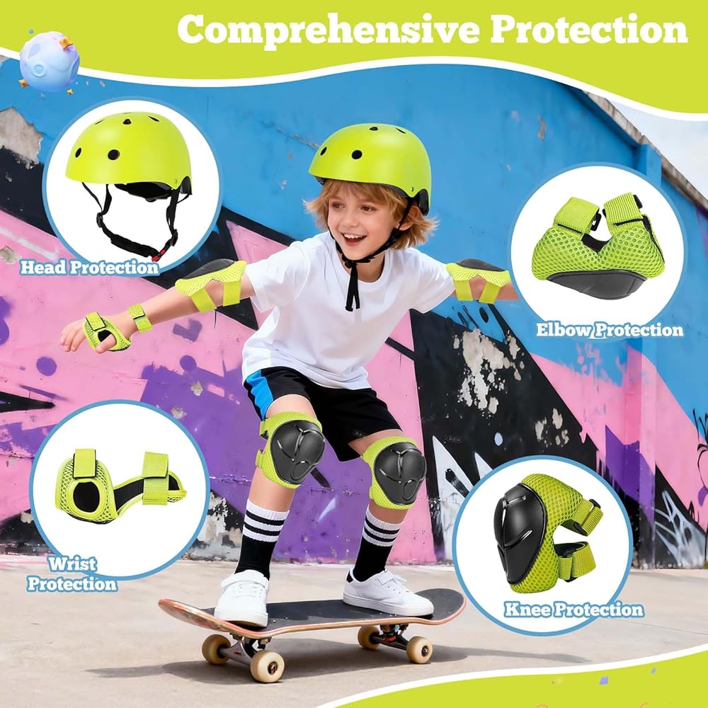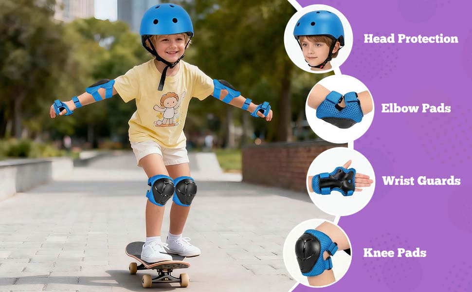 【7 In 1 Protective Gear Set】 This protective gear set includes 1 kids toddler helmet, 2 knee pads, 2 elbow pads, and 2 wrist guards. It is easy to carry with you for any outdoor activity and provides comprehensive protection for kids.