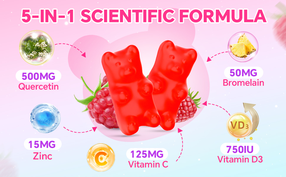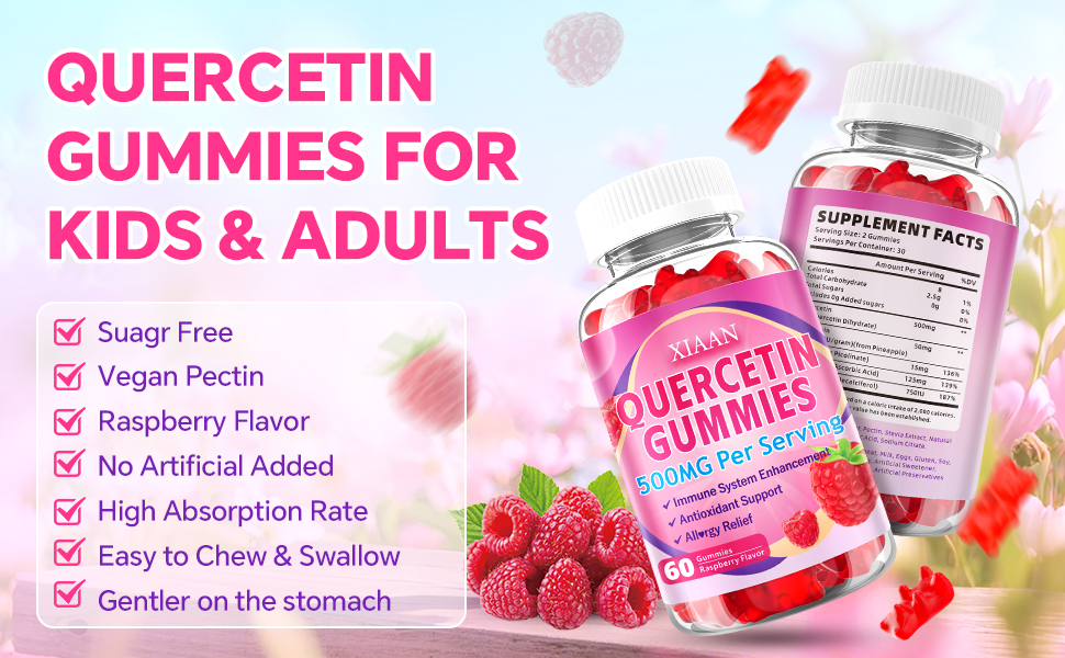 Quercetin Gummies 500mg for Kids & Adults, Organic Quercetin Supplements with Bromelain Zinc Vitamin C and D3 Support Antioxidant & Immune System Health, Strawberry Flavor 60 Count