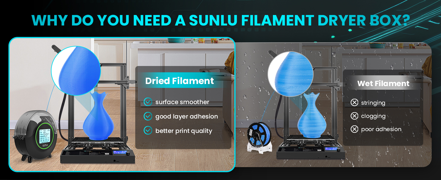 [360°CIRCULAR HEATING] SUNLU filament dryer box help you solve the problem of stringing, clogging and poor adhesion caused by wet filament. New S2 dry box with dual heating sheet and fan design achieve 360°all-round heating, increasing heating speed by 30%