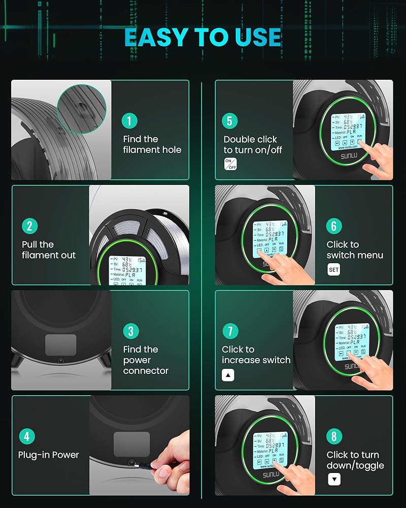 [PERSONALIZED SETTINGS] Maximum temperature can be set to 70°, helping you dry the filament quickly. Dried filament by 3d printer filament dryer has smoother surface,increasing layer adhesion. You can freely adjust the data of filament box according to different filament and environment