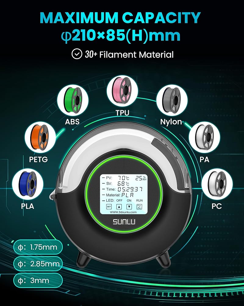 [HIGH COMPATIBILITY & EASY TO USE] Maximum capacity of filament holder is 210*85(H)mm. Ideal for all 3d printing filaments 1.75/2.85/3.00mm PLA PETG ABS TPU Nylon PA PC. Compatible with all major 3D printer filament brands.One click operation,Filament storage box with LED indicator shows real-time working status