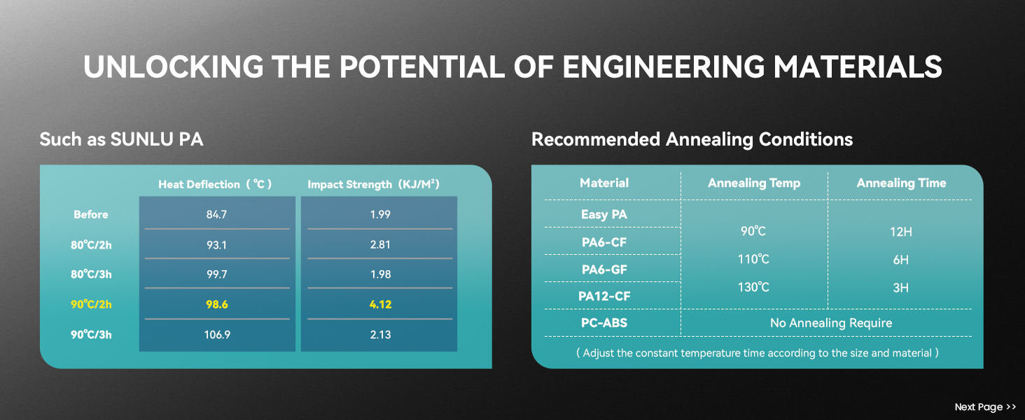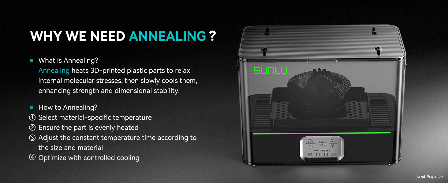 ④【Why We Need Annealing】- Annealing heats 3D-printed plastic parts to relax internal molecular stresses, then slowly cools them, enhancing strength and dimensional stability. Use SUNLU E2 Filament Dryer to help you create efficiently and unlimitedly.