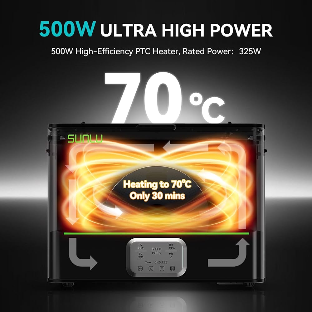③【500W PTC Heater】- SUNLU filament dryer E2 is equipped with a 500W PTC heater, 325W rated power, heating to 70°C only 30 min. Offering a high heating efficiency (30% higher than the FilaDryer S4).