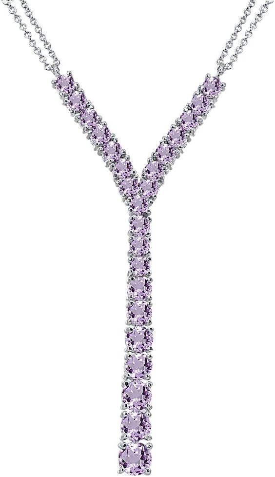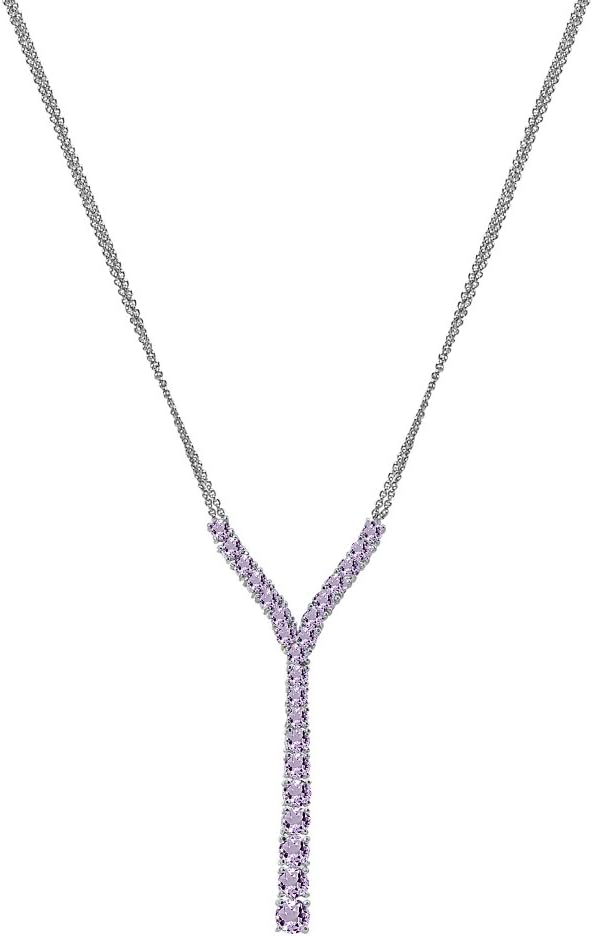 Wear this stylish statement necklace to enhance your daytime and evening attire. This stunning lariat necklace features round graduating gemstones in a dangling Y-shaped setting. This Y-necklace is secured by a spring-ring clasp and hangs from a 18 inch rolo chain plus a 3 inch extender. The necklace is crafted of fine sterling silver and is nickel & tarnish free.
