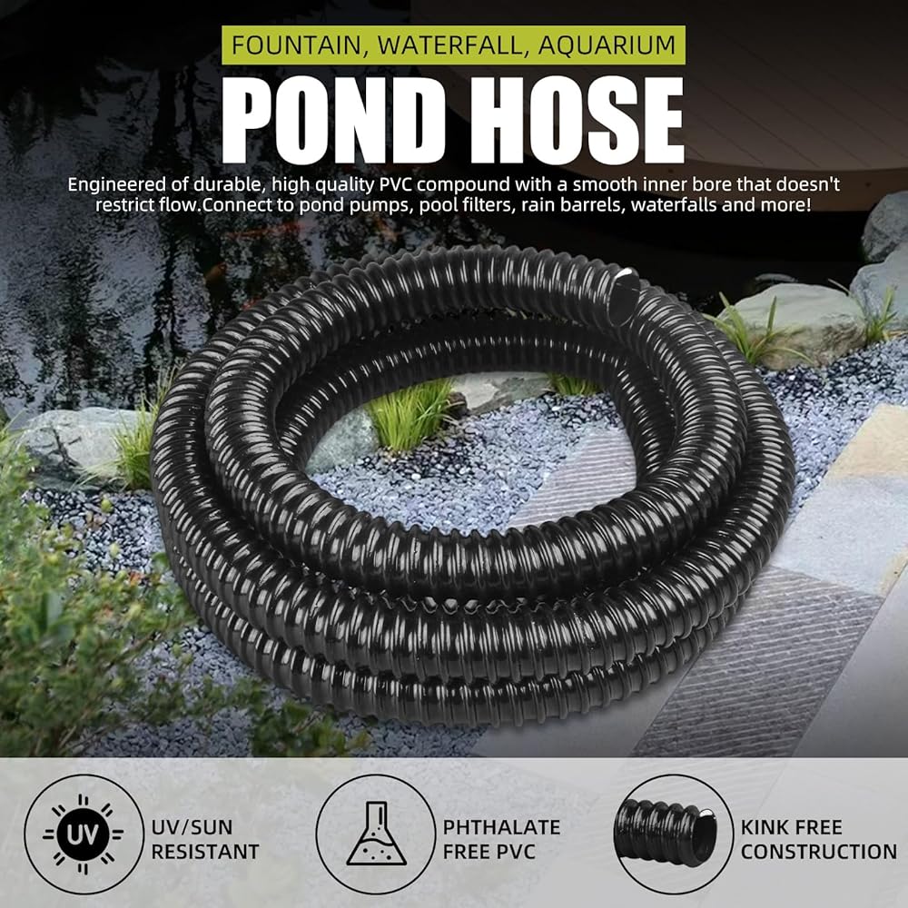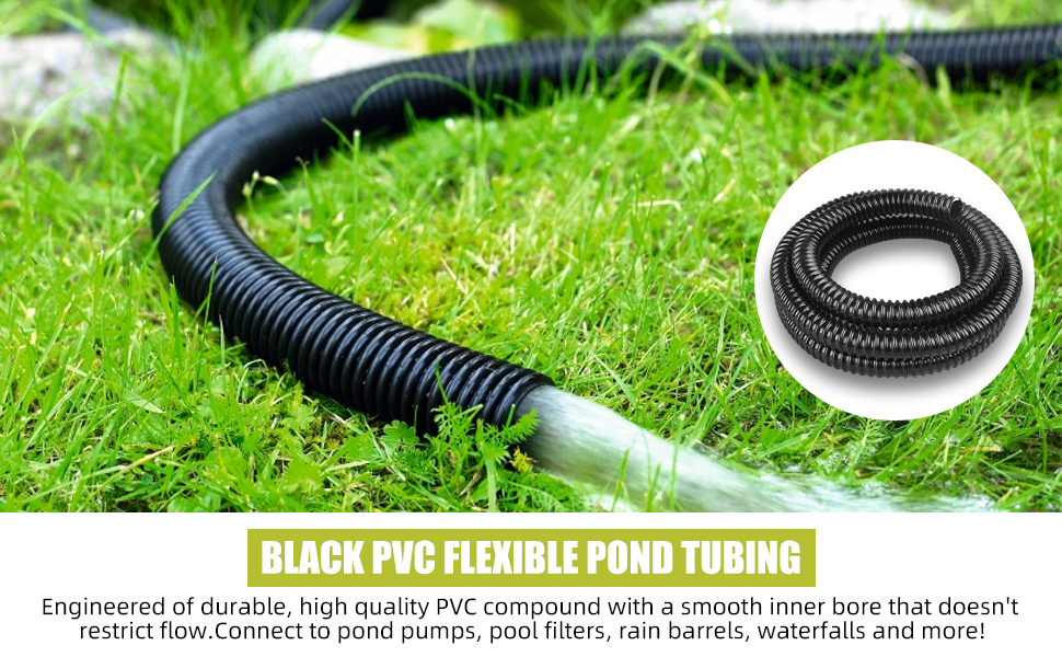 The pond tubing is made quality PVC reinforced with an integral helix of rigid PVC, durable, lightweight, anti-aging, kink-free, high abrasion resistant and excellent corrosion-proof, is perfect for any project that requires moving water
