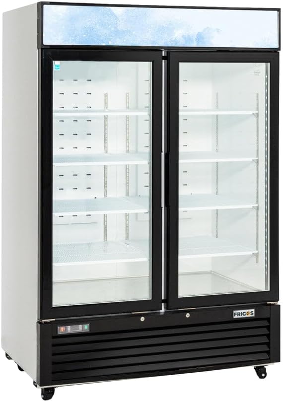 Elevate your business with the Frigos Premium FGP-RFM-49 Two Swing Glass Door Merchandiser Refrigerator, offering a spacious 49 cubic feet capacity designed to showcase your products in style. This commercial beverage refrigerator provides exceptional versatility and a temperature range of 33°F to 41°F, ensuring your items remain fresh and enticing to customers. Driven by a 1/4+ HP compressor situated in the bottom, this refrigerator effectively preserves the intended temperature, guaranteeing reliable cooling efficacy while staying easily serviceable. This guarantees that throughout the day, clients will continue to find your products appealing and fresh. Nema 5-15P plugs are easy to install in your office space and simplify the setup process. Whether you are setting up in a convenience shop, supermarket, or another type of retail venue, this Frigos Premium merchandiser refrigerator is a great way to improve your product display and preserve your inventory.