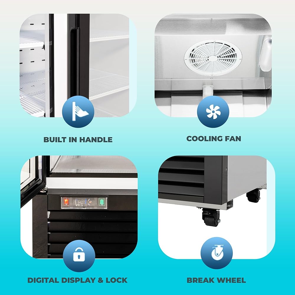 Ample Storage Space: With two swing glass doors and eight adjustable shelves, this commercial kitchen refrigerator offers ample space for your merchandise while allowing for a customizable arrangement. Whether you're displaying beverages, snacks, or other chilled items, this refrigerator accommodates your diverse product range with ease.
