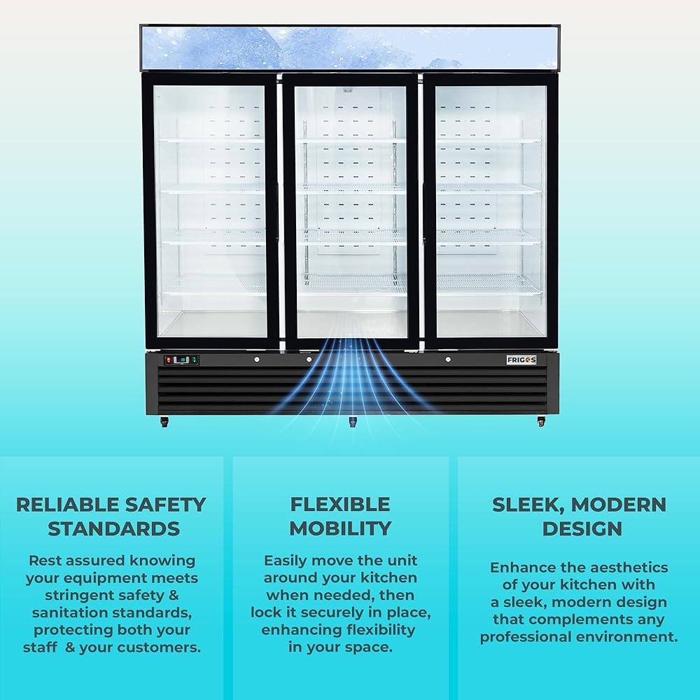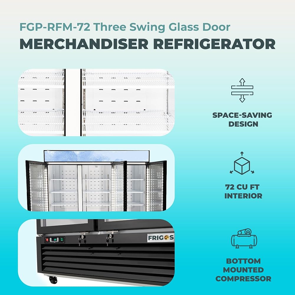 Elevate your store's refrigeration with the Frigos Premium FGP-RFM-72 Swing Glass Door Merchandiser Refrigerator, offering an impressive 72 cubic feet of storage space. This refrigerator is designed to showcase your products in style while keeping them fresh and ready for customers to enjoy. This unitretail refrigerator display provides easy access to your items and allows for versatile arrangement with its three swinging glass doors and twelve movable shelves. Adapt the arrangement to your inventory, whether it be snacks, drinks, or other chilled goods. Durable white powder-coated steel on the exterior gives it a sleek appearance that goes well with the interior design of your store. The interior is composed of stainless steel and white powder-coated steel for increased hygienic and strength, guaranteeing the longevity and cleanliness of your refrigerator unit.