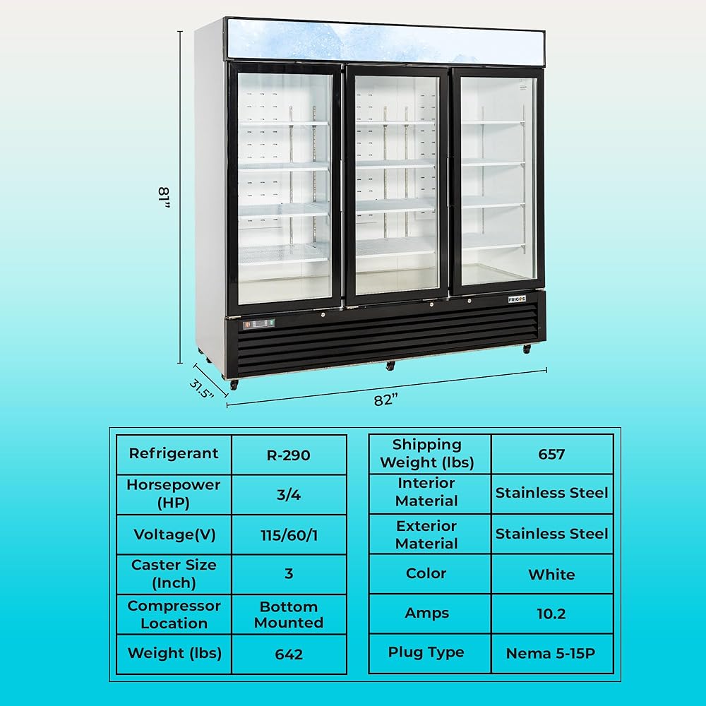 Flexible Arrangement and Easy Access: With three swinging glass doors and 12 adjustable shelves, this unit allows for flexible arrangement and easy access to your items. Customize the layout to suit your merchandise, whether it's beverages, snacks, or other chilled products.