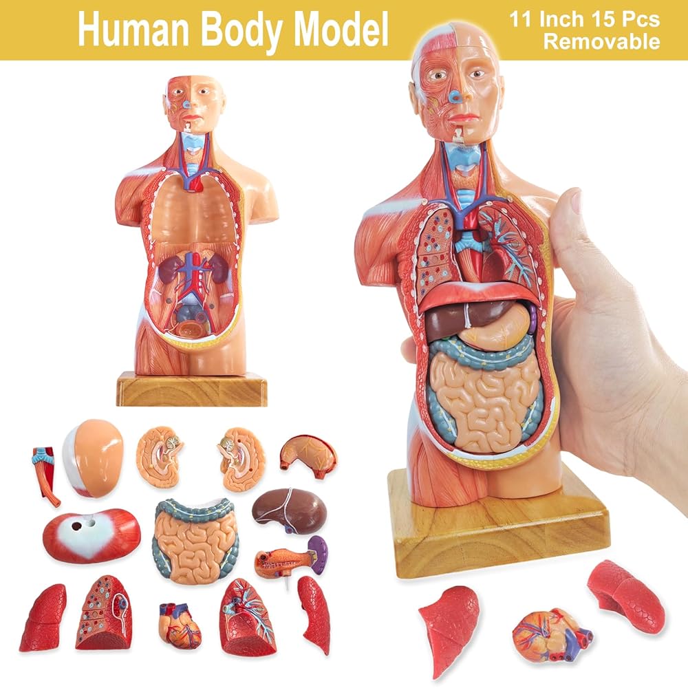 Upgraded Torso Model: This is a new PT teaching model contains 15 detachable parts including torso, brain(2 parts),heart, esophagus trachea and aorta, lung (4 parts), skull cap,stomach, diaphragm, liver, pancreas and spleen, intestine.