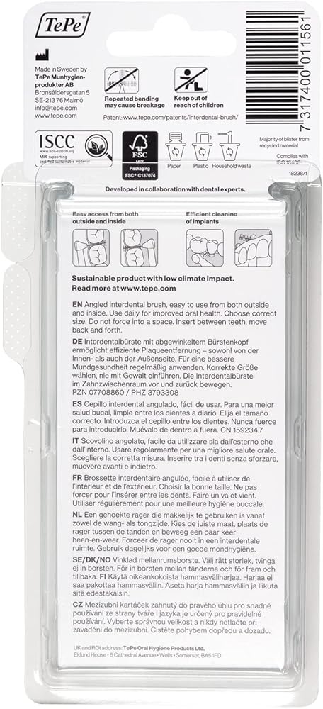 An interdental brush is the most efficient way to remove plaque between the teeth in a user-friendly way. It's designed to clean the gaps where a regular toothbrush is unable to reach. By only using a toothbrush you clean 60% of your teeth, but by adding an interdental brush to your oral care routine, you will clean up to 100% of your teeth. TePe Angle has a long handle and an angled brush head for easier access . TePe Angle is avaiable in 6 different sizes and the TePe Angle Blue is ISO size 3, to fit narrow gaps. Use daily to keep teeth and gums healthy and fresh.