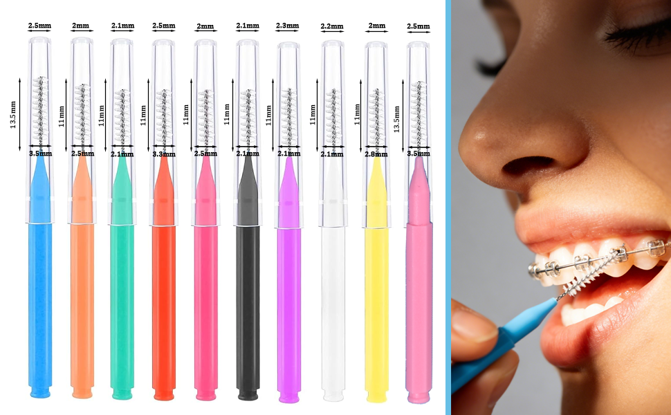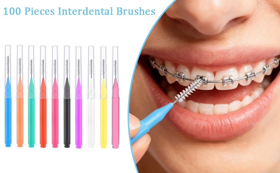 • Complete 100-Piece Set: Includes 100 interdental brushes in 8 different sizes and 10 vibrant colors (pink, white, purple, green, yellow, orange, red, sky blue, and 2 shades of black)—10 brushes per color for household use.