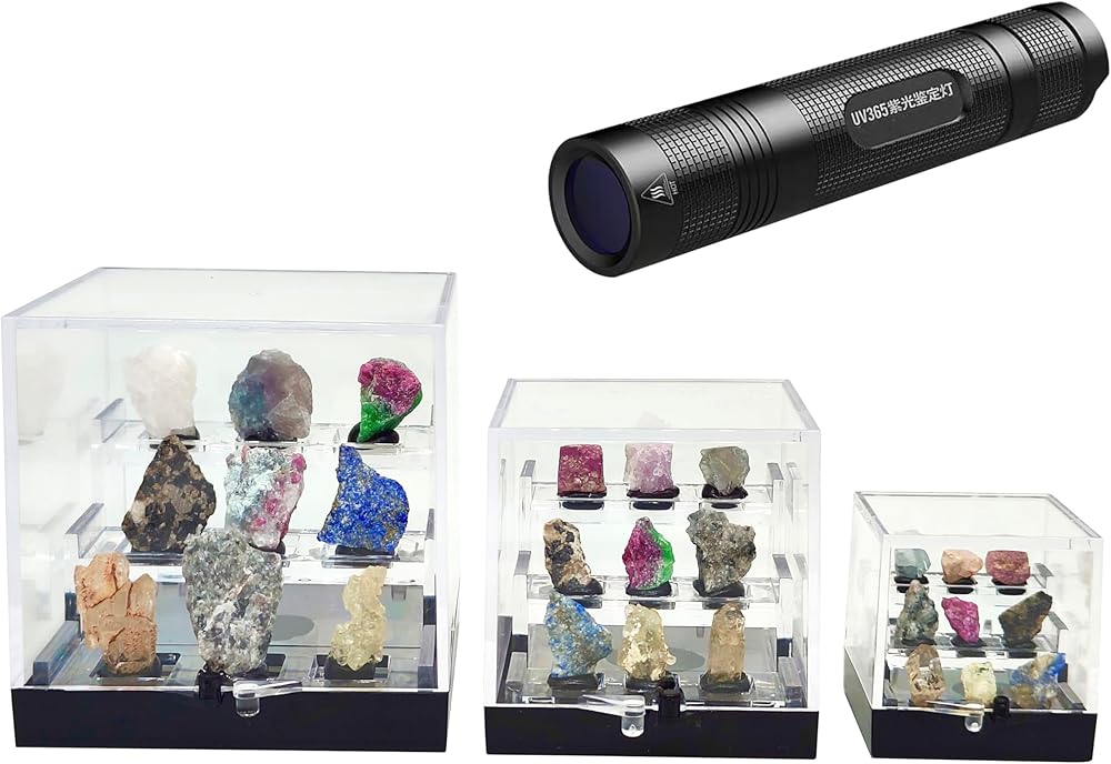 Discover the mesmerizing world of fluorescent minerals with this fascinating specimen collection set. Each set features naturally occurring mineral specimens arranged in a tiered display of clear acrylic cases - large (2.68-inch), medium (1.97-inch), and small (1.38-inch) squares. When illuminated with the included UV light, these raw minerals transform into a stunning array of vibrant colors, creating an otherworldly light show. The set includes nine unique specimens, each one naturally formed and distinctive in its appearance and fluorescent properties. Perfect for collectors, science enthusiasts, or anyone fascinated by nature's hidden wonders, this display set offers both educational value and visual intrigue. The transparent cases provide excellent visibility while protecting these delicate specimens. Since these are natural minerals, each piece is one-of-a-kind, with variations in size, shape, and exact coloration, making your collection truly unique. This set serves as an impressive demonstration of mineralogy and the fascinating properties of fluorescent rocks.