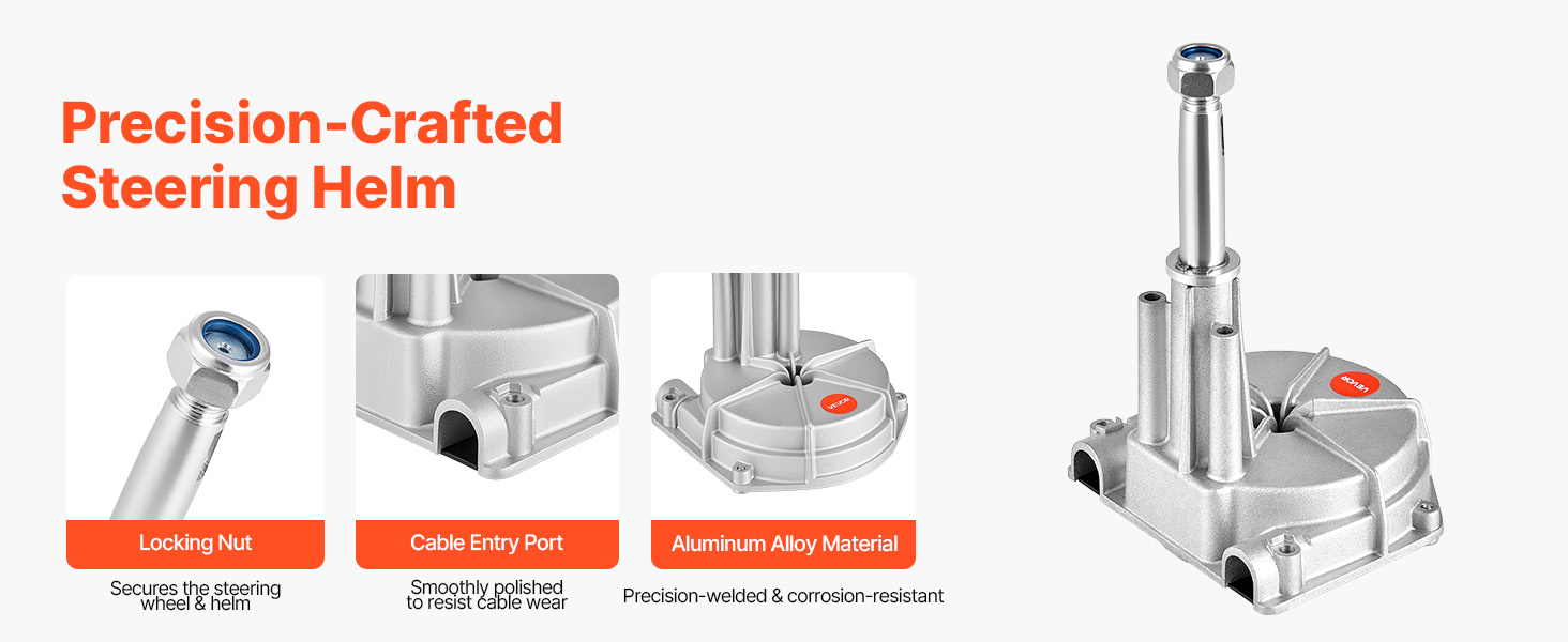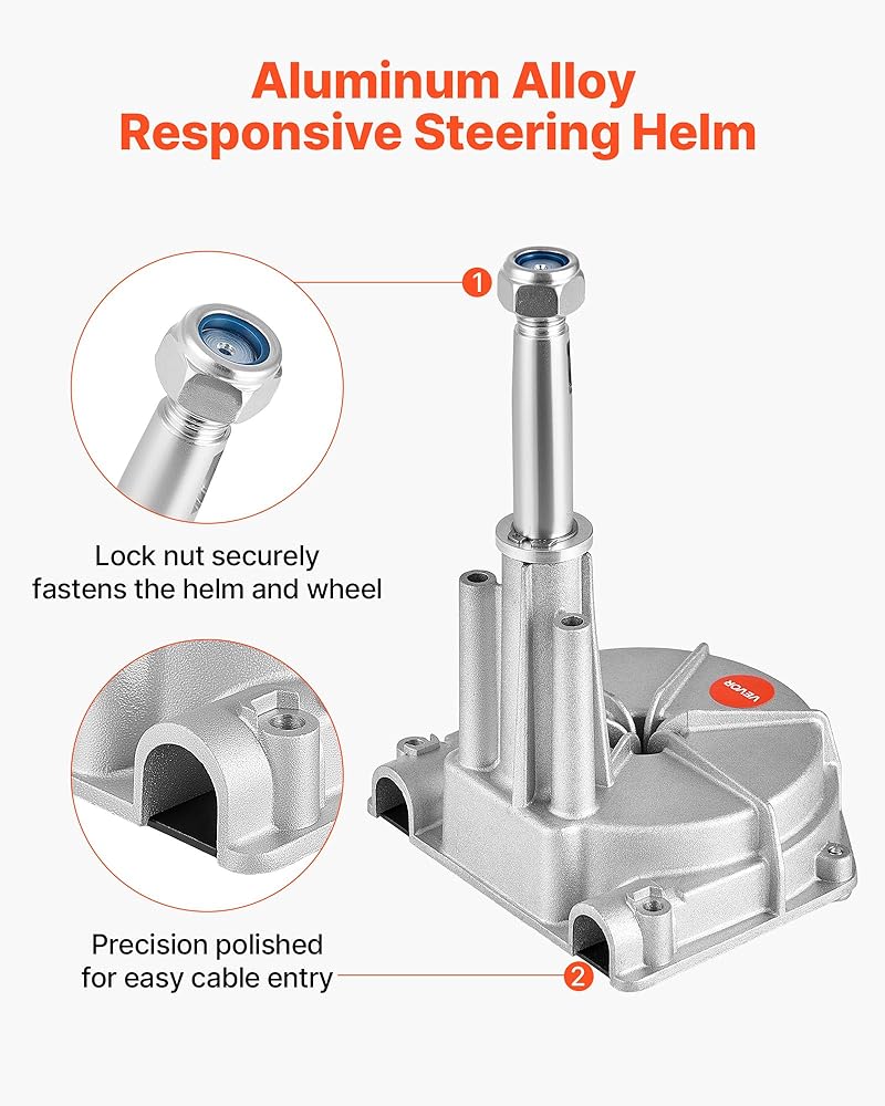Aluminum Alloy Helm: The helm in our boat steering kit is made from corrosion-resistant aluminum alloy for long-lasting marine durability. As a mechanical helm, it requires no hydraulic oil. This design helps reduce maintenance costs
