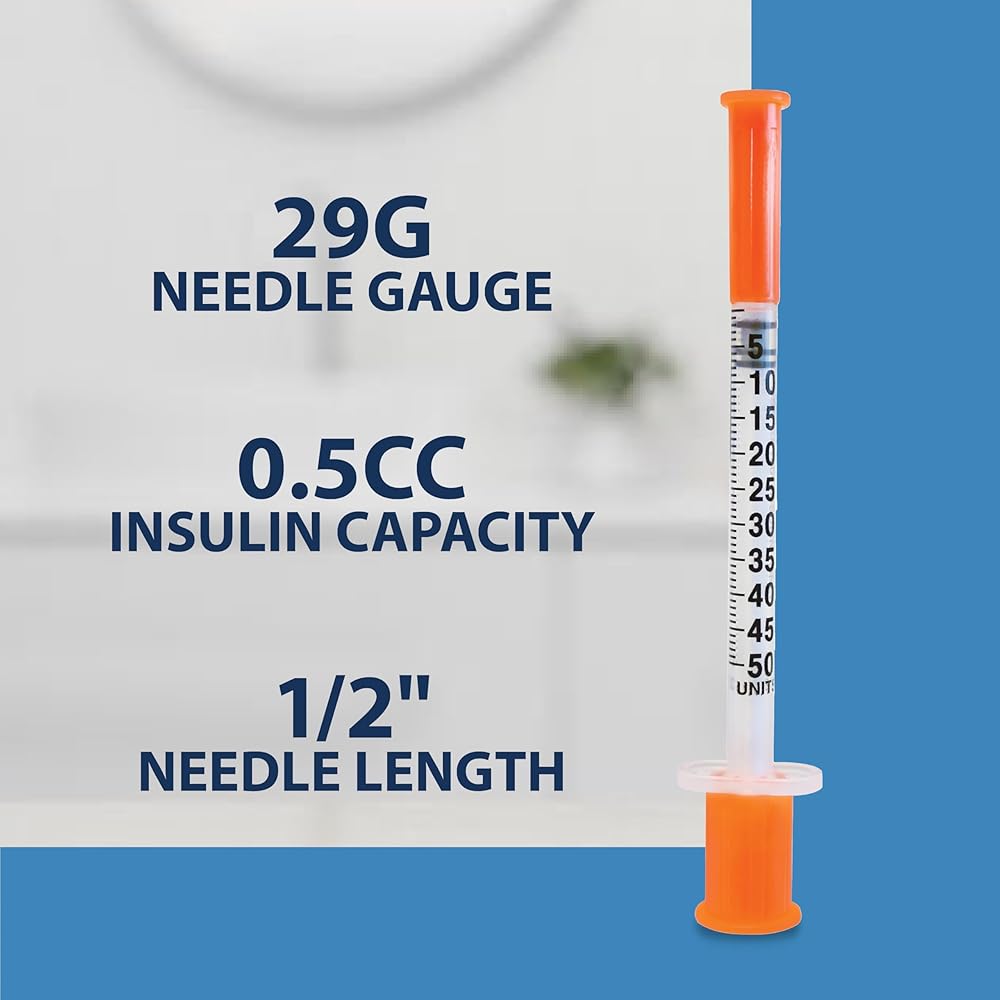 100 Count Box: Includes 100 single-use insulin syringes (10 packs of 10) with a 29G needle gauge, 0.5cc insulin capacity, and 1/2" stainless steel needle length
